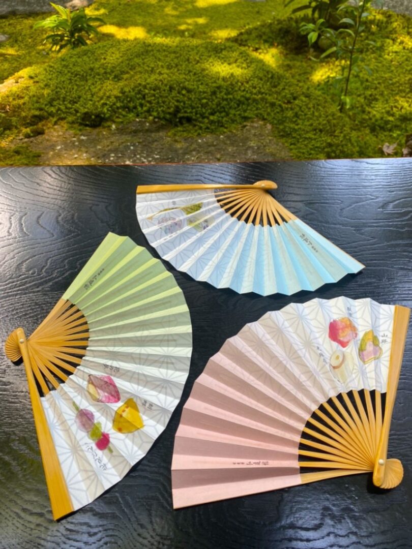 京菓子展オリジナルデザイン、春・夏・秋と3種類の茶道用扇子(五寸・裏千家女性用)をご用意しました。